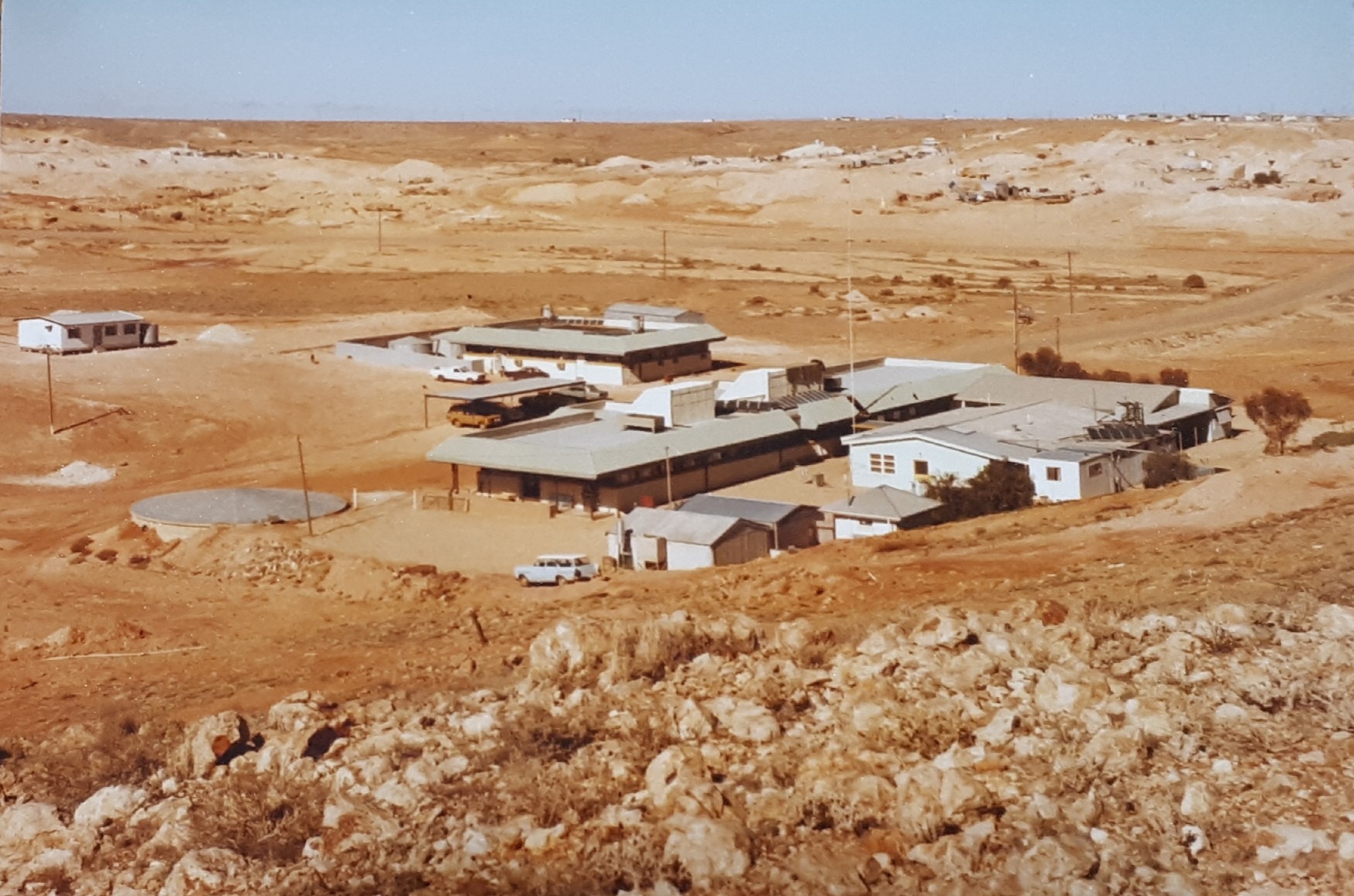 1978 Overlooking the Coober Pedy Hospital with the relocation of the transportable accommodation (Matrons Flat) from its original location being to the right of the original medical centre building to the far side of the hospital grounds where it stands isolated and away from other buildings (courtesy of Coober Pedy Hospital & Health Services).